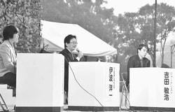 パネル討論「新基地ノー、『オール沖縄』の願い実現へ―県知事選でオナガ氏勝利を」が1日午前、赤旗まつり野外ステージで開かれました。いまたたかわれている沖縄県知事選(16日投票)の意義と争点について、「オール沖縄」の代表として立候補したオナガ雄志(たけし)氏と、新基地予定地を抱える名護市の稲嶺進市長のビデオメッセージを交え、元宜野湾市長の伊波洋一氏、ジャーナリストの吉田敏浩氏、日本共産党の田村智子参院議員、沖縄から電話出演した赤嶺政賢衆院議員が討論しました。