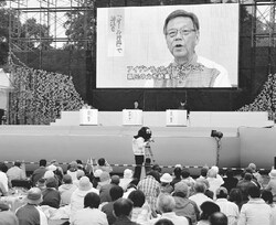 野外ステージのスクリーンには美しい辺野古の海の写真が映しだされ、吉田氏が、埋め立てボーリング調査に抗議する住民に対し過剰警備で応じる海上保安庁の横暴ぶりを告発。サンゴの海にパイプを突き刺しながら、法律を拡大解釈し、抗議する人たちを海に突き落とし拘束している安倍政権のやり方は「戦後、米軍が銃剣とブルドーザーで住民の土地を奪ったことの二重写しとみられている」と批判しました。