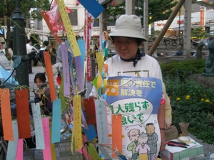 「世界に誇れる憲法を守って、いくさのない地球を子どもらに 田村さんに託します」「はやく安心して暮らせる世の中になってほしい」など、願いが書かれた七夕のステージを飾りました。つどいには、前参議院議員の井上美代さんも出席。秘書時代の田村さんが、アスベスト問題やサービス残業根絶の問題などで、井上さんと二人三脚で質問作りにとりくんだことを紹介。「国会議員として即戦力になること間違いなし」と支持をひろげるよう呼びかけました。